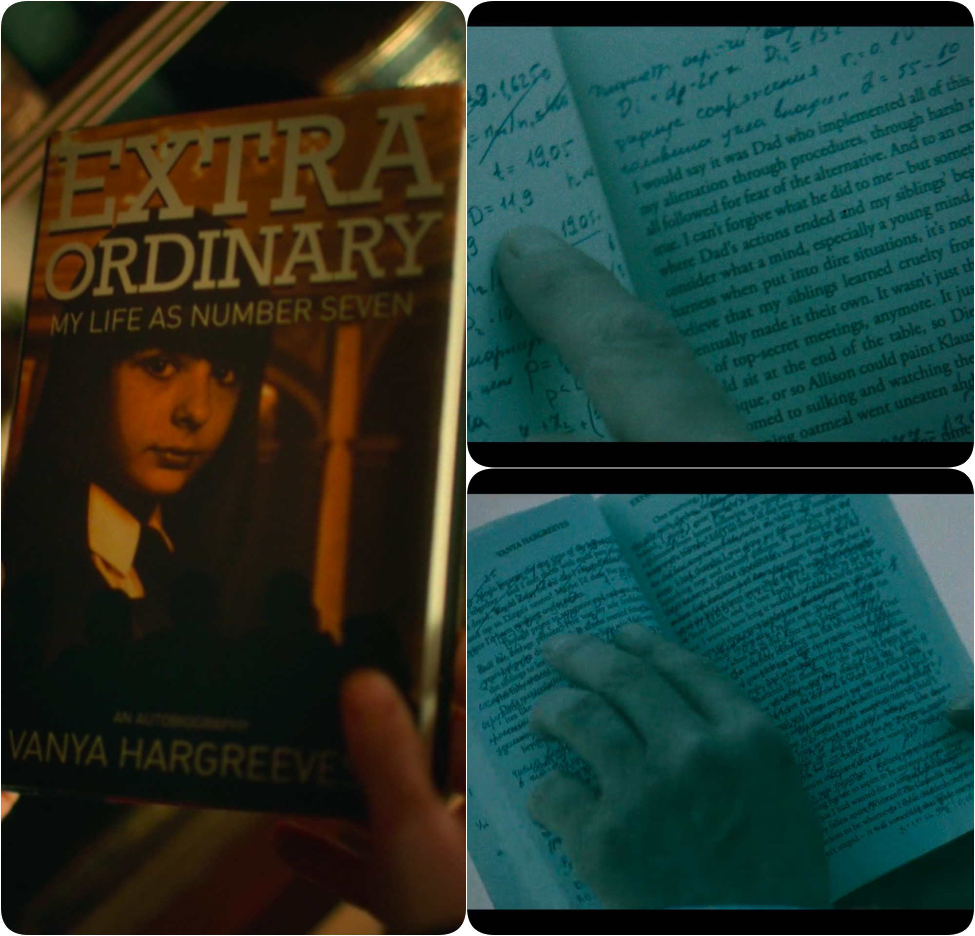 — ITEM THREE: His copy of Extra-Ordinary: My Life As Number Seven, with all his scribbled equations inside of it.